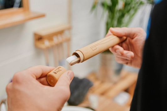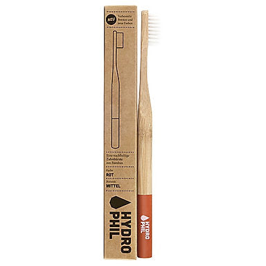 Tandborste av snabbväxande Moso bambu med ett borsthuvud av vegetabiliskt nylon av ricinfröolja och skaft färgade med naturlig färg.