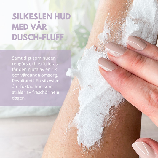 Dusch-fluffen är en 3-i-1 produkt som kombinerar duschtvål, peeling och bodylotion. Den masseras försiktigt på fuktig hud och sköljs sedan av noggrant.