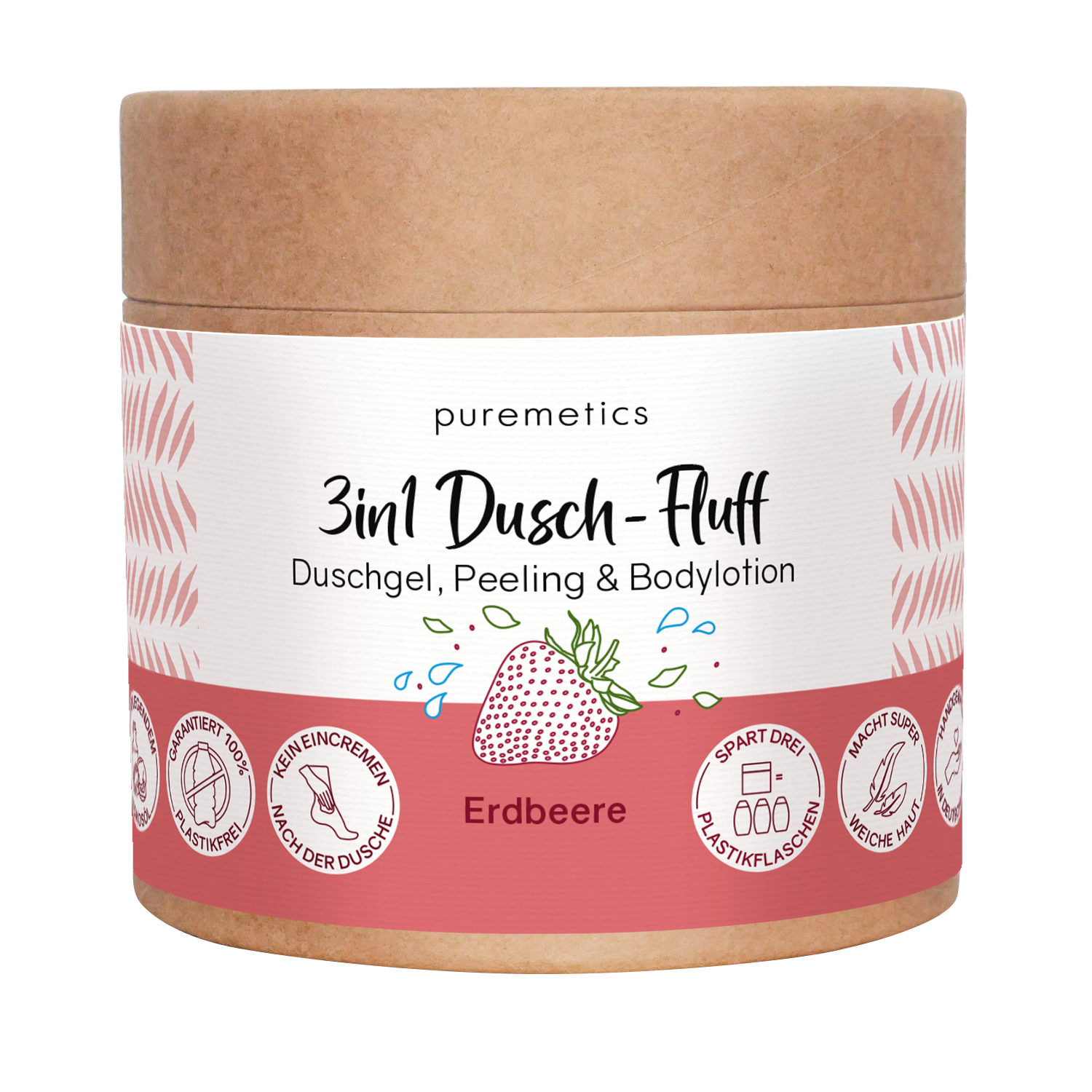 Förvandla din dusch till ett lyxigt spaögonblick med Puremetics 3-in-1 Dusch-Fluff “Strawberry"" – en silkeslen mousse som kombinerar duschtvål, peeling och bodylotion i en enda produkt. Den krämiga formulan smälter mot huden, löddrar lätt och lämnar huden ren, len och underbart återfuktad.