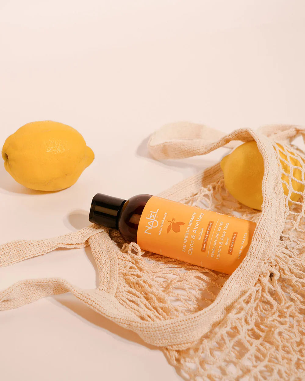 Upptäck vårt citron- och Aloe Vera-blomvatten – en perfekt kombination av natur och effektivitet. Framställt genom hydrodestillation av fruktskal med ekologisk Aloe Vera, erbjuder detta ansiktsvatten en naturlig lösning för blandhy, fet hud och hud med orenheter. Citron, en kraftfullt sammandragande ingrediens, hjälper till att reglera överskott av sebum samtidigt som den drar samman porerna. Aloe Vera, känd för sina lugnande och återfuktande egenskaper, bidrar till att lindra irritationer. Tack vare sina ekologiska och naturliga ingredienser avlägsnar vårt blomvatten skonsamt orenheter och lämnar huden fräsch och ren.